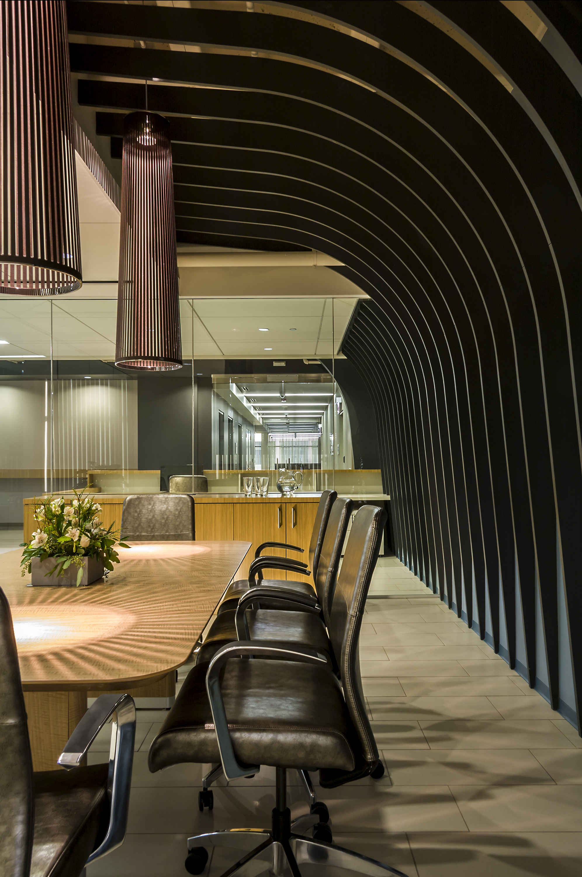 The design theme of the office was inspired by the company’s warmth. Their new corporate logo, a matrix of overlapping arches, seemed to us to communicate a nurturing and caring environment. OKW worked with a derivation of that form and introduced it in key shared spaces throughout the office. One side of the main reception area and conference room is defined by a dramatic array of the arches. This array extends from the elevator lobby through the conference room, serving as a focal point for visitors entering the lobby, communicating a sense of protection and warmth. The theme continues into a collaborative area at the center of the office serving the graphic design team.